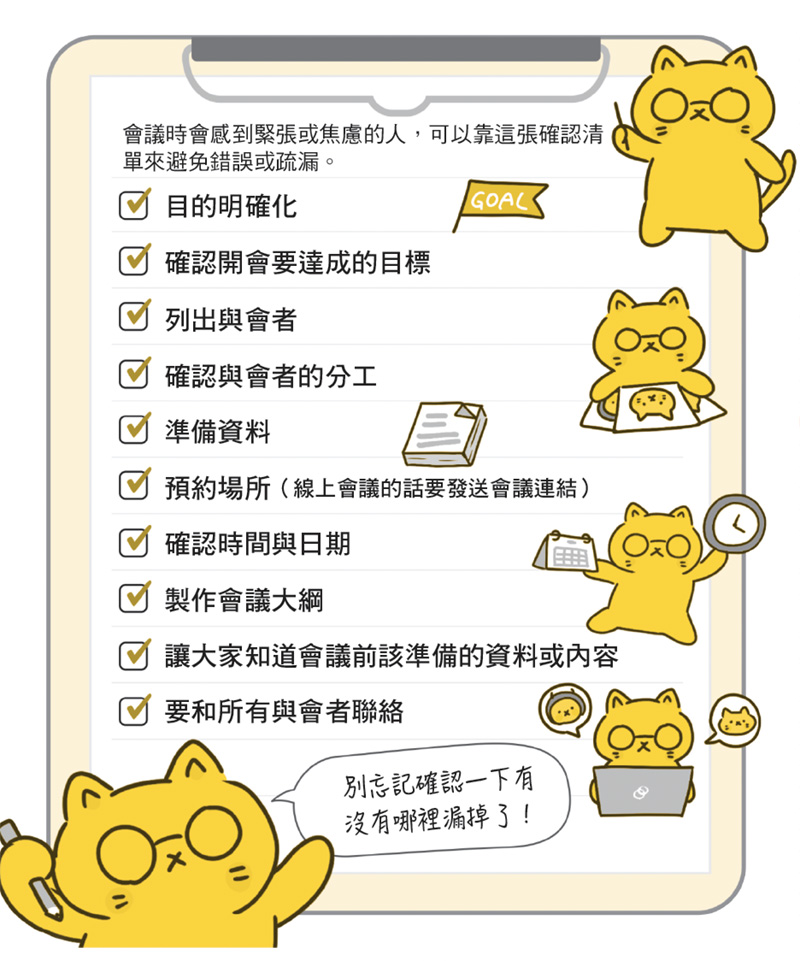 會議的事前準備包括擬定計劃、資料準備、通知等,若能是先列好檢查清單,可以確保不疏漏,掌握進度與推進工作。書中建議的會議前置準備清單如下: