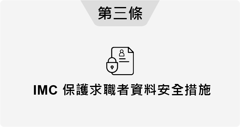 依據中華民國相關法律之規定,IMC 除了對求職者基本資料依法保密外,舉凡資料傳輸過程的安全、使用者身份認證、登入權限設定、後端實體保護以及公司內部人員作業流程的控管,都經 IMC 納入整體規劃和保護措施之中。求職者與求才廠商利用 Internet 接受 IMC 的服務時,毋須擔心基本資料外洩。
