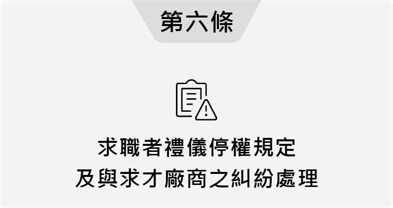 6.違反誠信原則:例如(但不限於),以求職或求才名義對徵才或應徵方作出不符合其所宣稱求職或求才目的之要求或作為,或就IMC所登載之求職、求才內容有不實或隱瞞,以及於IMC所登錄的求職、求才內容不符法律規定或公序良俗者。